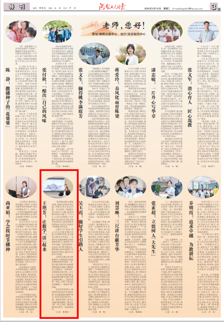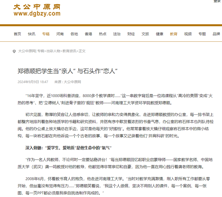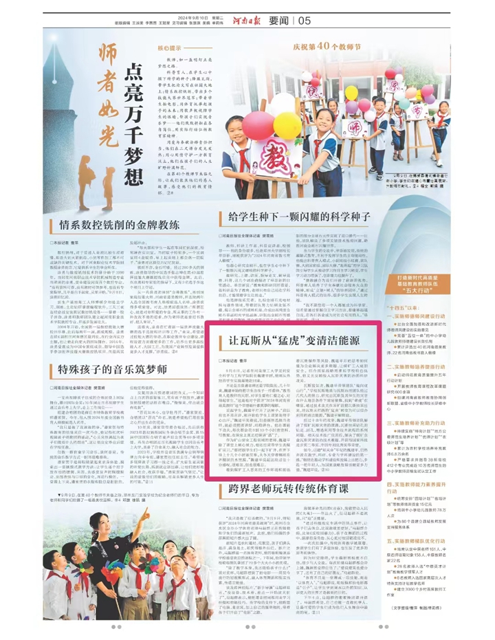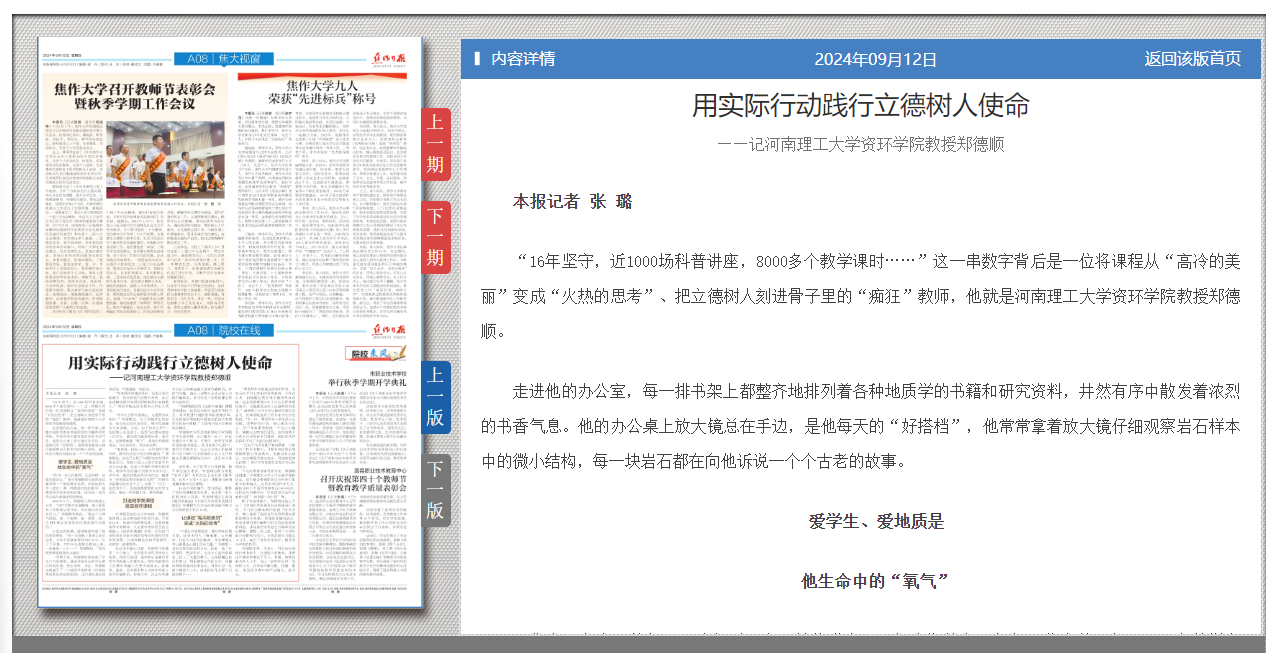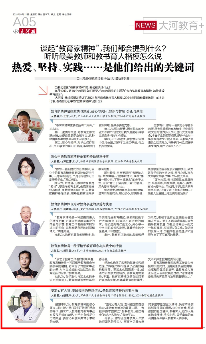 9月10日,《河南日報》《河南工人日報》等主流媒體,聚焦“大力弘揚教育家精神,加快建設教育強國”,宣傳報道學校安全學院教授魏建平、資環學院教授鄭德順、數信學院副教授王艷芳先進事跡,他們用實際行動踐行“嚴慈嚴謹嚴格”的教風,用無私奉獻的育人精神,照亮了莘莘學子的前行之路。相關內容如下: