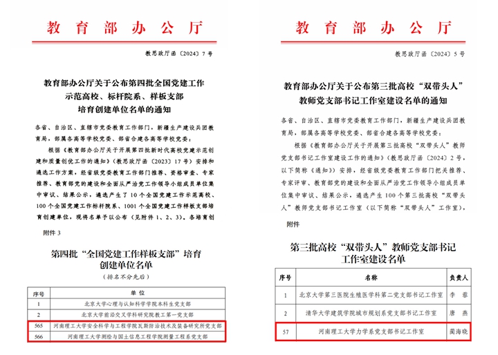 本網訊(通訊員 梁心愿)近日,教育部辦公廳公布了第四批全國黨建工作樣板支部培育創建單位名單和第三批全國高校“雙帶頭人”教師黨支部書記工作室建設名單,學校安全學院瓦斯防治技術及裝備研究所黨支部、測繪學院測量工程系黨支部等2個黨支部入選第四批“全國黨建工作樣板支部”培育創建單位;學校土木學院力學系黨支部作為河南省高校唯一基層黨組織入選第三批全國高校“雙帶頭人”教師黨支部書記工作室(全國高校僅100個黨支部入選),取得學校在該項榮譽的首次突破。
