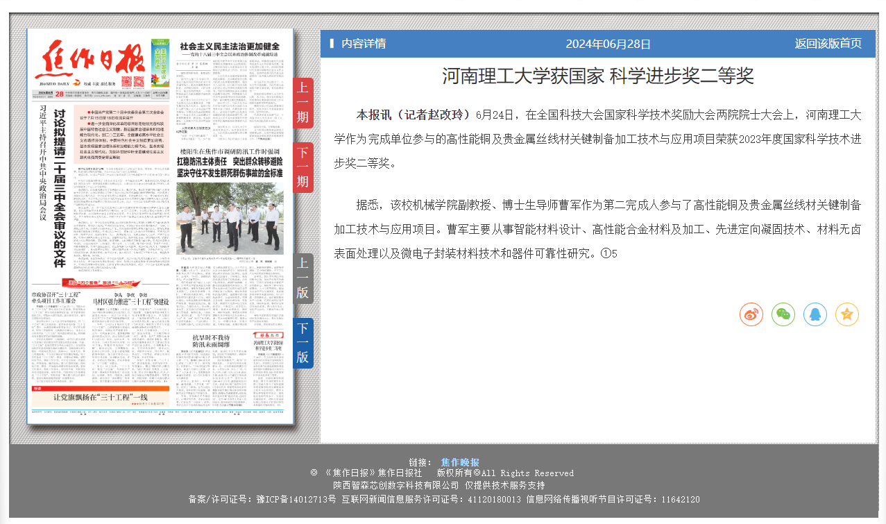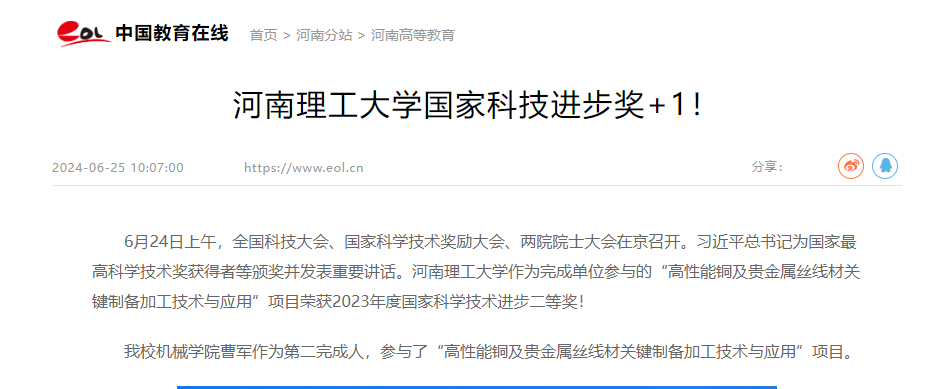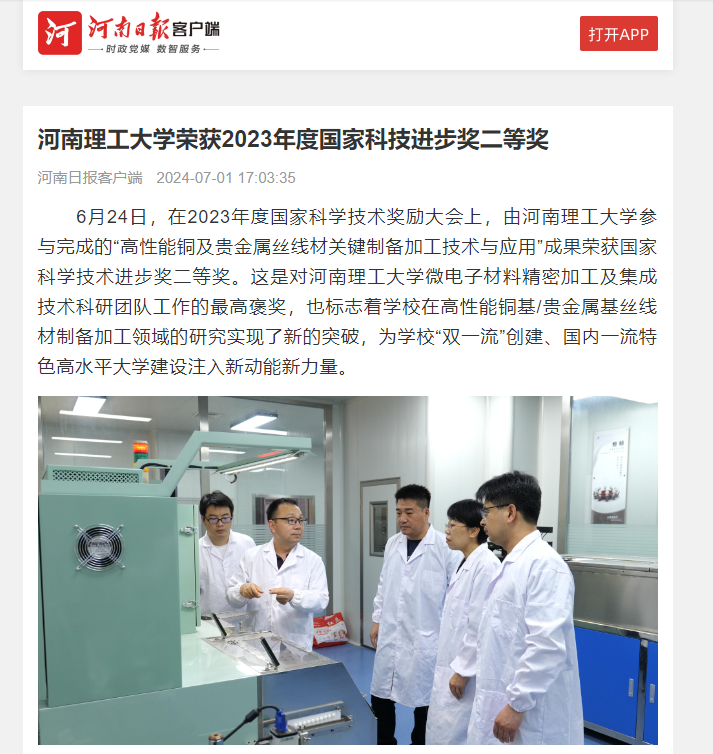 日前,在2023年度國家科學技術獎勵大會上,由河南理工大學參與完成的“高性能銅及貴金屬絲線材關鍵制備加工技術與應用”成果榮獲國家科學技術進步獎二等獎。連日來,中國科學報、河南日報等媒體進行了報道。相關內容如下: