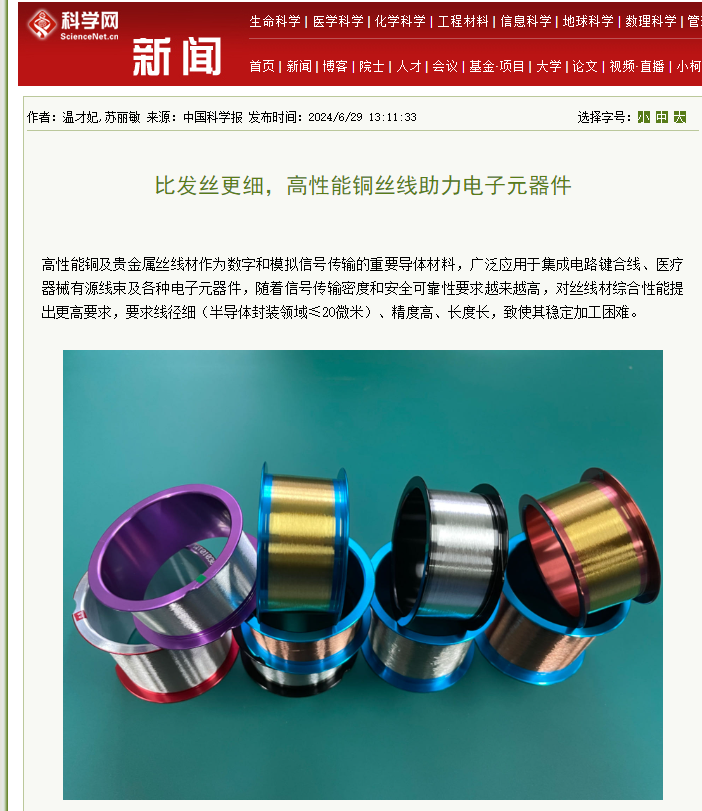 高性能銅及貴金屬絲線材作為數字和模擬信號傳輸的重要導體材料,廣泛應用于集成電路鍵合線、醫療器械有源線束及各種電子元器件,隨著信號傳輸密度和安全可靠性要求越來越高,對絲線材綜合性能提出更高要求,要求線徑細(半導體封裝領域≤20微米)、精度高、長度長,致使其穩定加工困難。