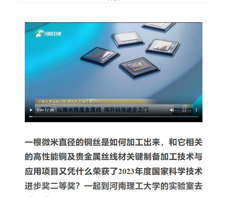 日前,在2023年度國家科學技術獎勵大會上,由河南理工大學參與完成的“高性能銅及貴金屬絲線材關鍵制備加工技術與應用”成果榮獲國家科學技術進步獎二等獎。作為第二完成人,河南理工大學副教授曹軍表示,該項目突破了銅及貴金屬絲線材成分組織均勻性和尺寸穩定性控制的共性技術難題,開發出具有自主知識產權的核心制備加工技術,實現了高性能極細絲線材的高精度、大長度穩定生產。