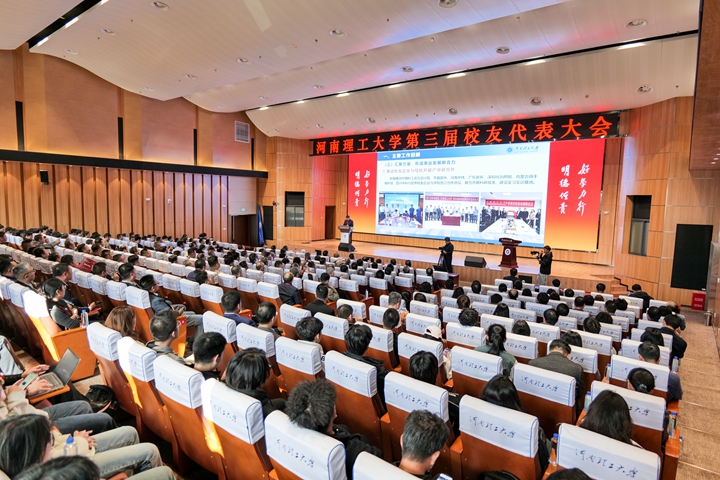 激昂的校歌拉開大會序幕。會上,選舉產(chǎn)生了學校校友會新一屆理事會及負責人、監(jiān)事,趙同謙當選第三任會長。會議審議通過了《河南理工大學校友會第二屆理事會工作報告》,審議并表決通過了《河南理工大學校友會章程(修訂草案)》。第二任會長楊小林和第三任會長趙同謙進行會旗傳遞。