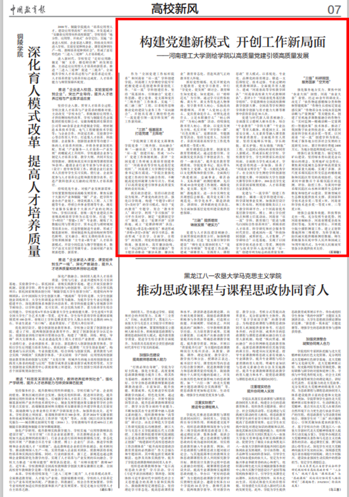 10月17日,《中國教育報》以《構建黨建新模式 開創工作新局面》為題,聚焦黨的建設、人才培養、學科發展、社會服務等工作,全面展示測繪學院近年來高質量黨建引領高質量發展的豐富成果,具體內容如下: