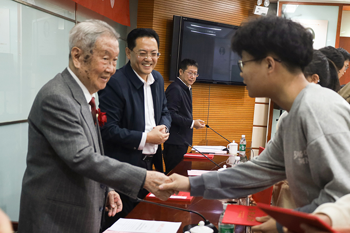 會上,邊亞東宣讀表彰文件。張飛燕等10名教師,王文強、孔紳宇等30名本碩同學分別獲得“朱訓教育獎勵基金優秀教師獎”和“朱訓教育獎勵基金優秀學生獎”。教師代表張飛燕、學生代表湯貝分別發言,向朱訓先生致以崇高敬意,并表達了勤耕不輟、孜孜不倦、奮勇向前的決心。